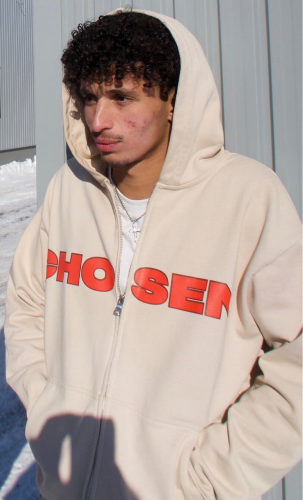 The zip-up hoodie is comfortable, oversized, and made with 88% cotton. Each zip-up is screen-printed with 'Chosen' on the front, separated by the zipper. The back features a design with 'Chosen By God' under a globe, with '1 Peter 2:9' in the center. Below 'God,' 'Class of Eternal Life' is written in cursive. The design is completed with the final part of the verse: 'To proclaim the praises of Him who called you out of darkness into His marvelous light,' along with prayer hands and a cross.